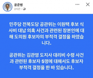 전북도당 공직선거후보자추천관리위원회(공관위)는 해당 사안에 대한 심사를 거쳐 김슬지 도의원을 도의원 후보 부적격자로 결정했다고 밝혔다. 윤준병 도당위원장은 17일 자신의 페이스북을 통해 “식사비 대납 의혹 사건과 관련된 당사자에 대해 공관위가 후보 부적격 결정을 내렸다”고 설명했다.
